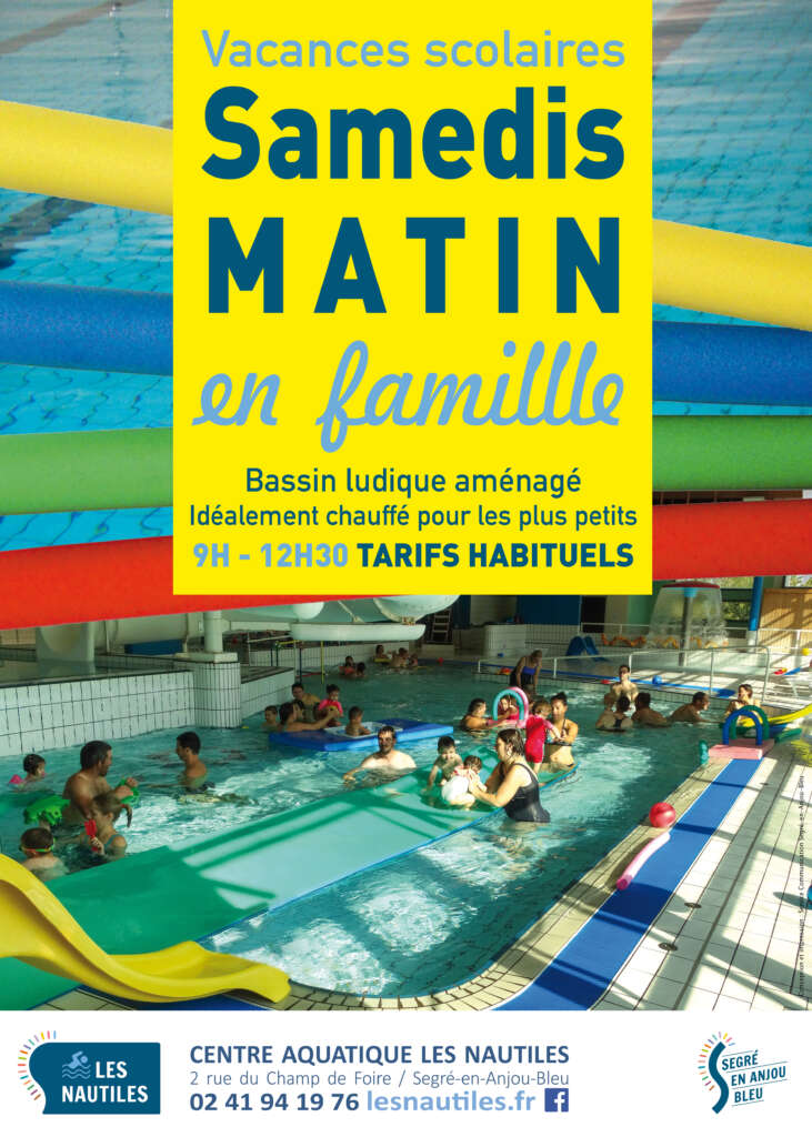 Les samedis des vacances scolaires de 9h à 12h30 au centre aquatique Les Nautiles. Bassin ludique aménagé. Idéalement chauffé pour les plus petits Infos : 02 41 94 19 76