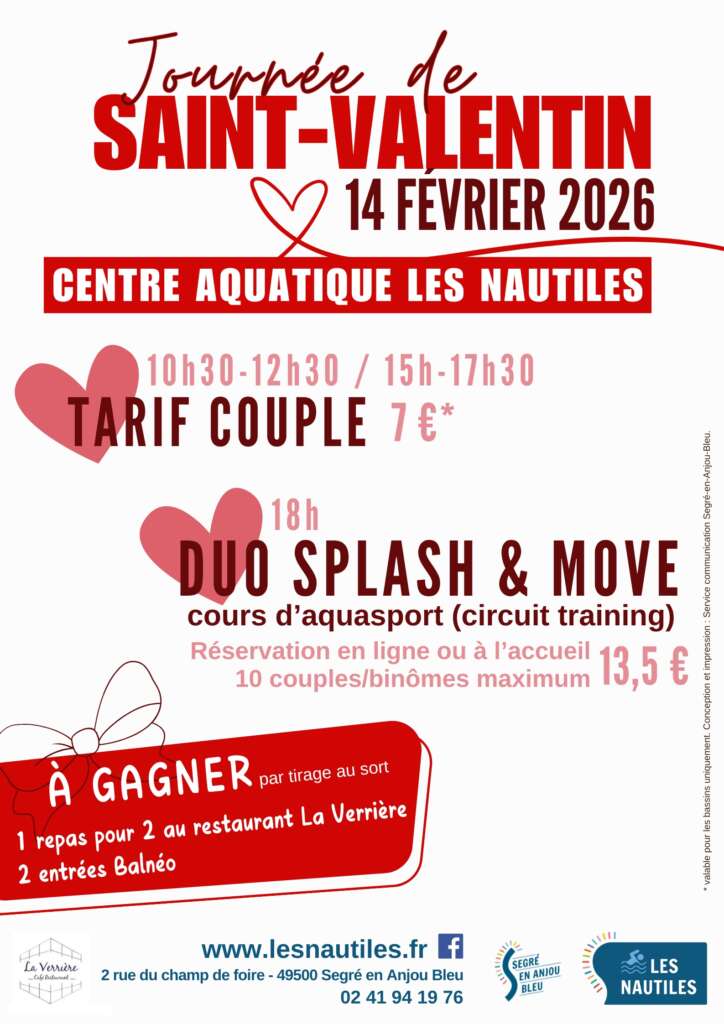 Journée Saint Valentin aux Nautiles 10h30-12h30/15h-17h30 : Tarif spécial couple : 7 € (valable uniquement pour les bassins) 18h : Duo splash & move sur réservation en ligne (à partir du 31 janvier 2026) ou à l'accueil : 13,50 €…
